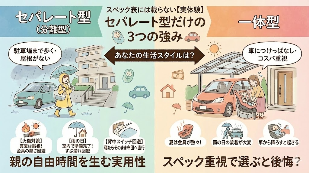 - セパレート型がおすすめな人:駐車場まで歩く・屋根がない
