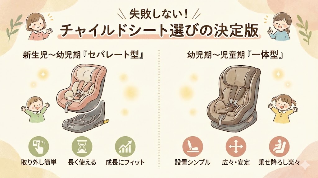 チャイルドシートのセパレート型と一体型はどちらがおすすめなのかまとめました。