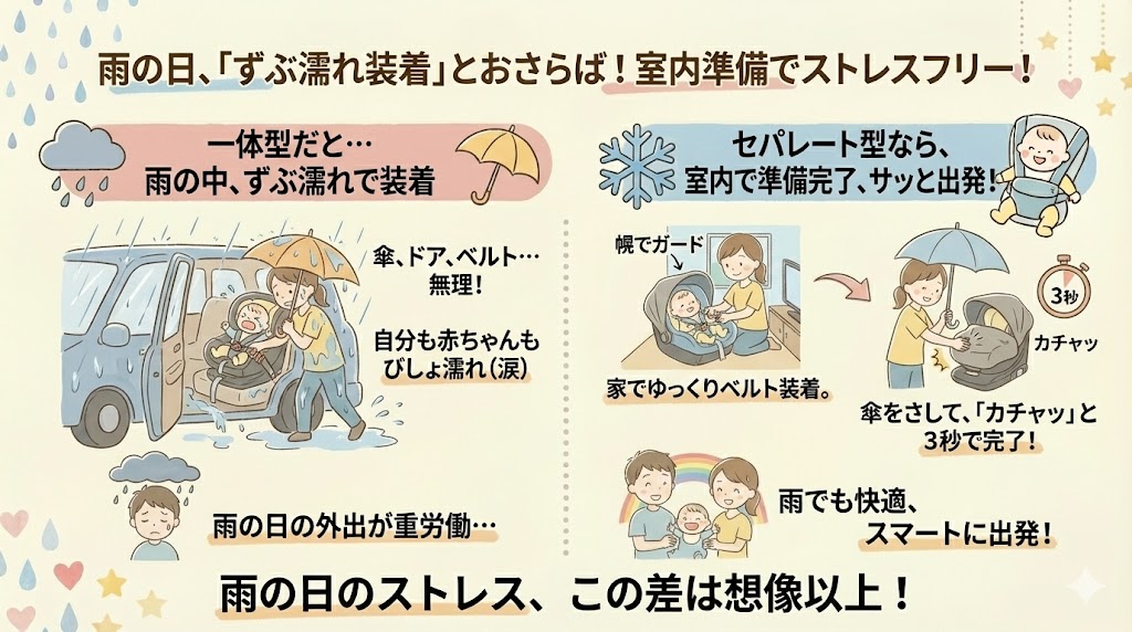 - 一体型: 雨の中、親は傘をさして車のドアを開け、身を乗り出してベルトを装着。