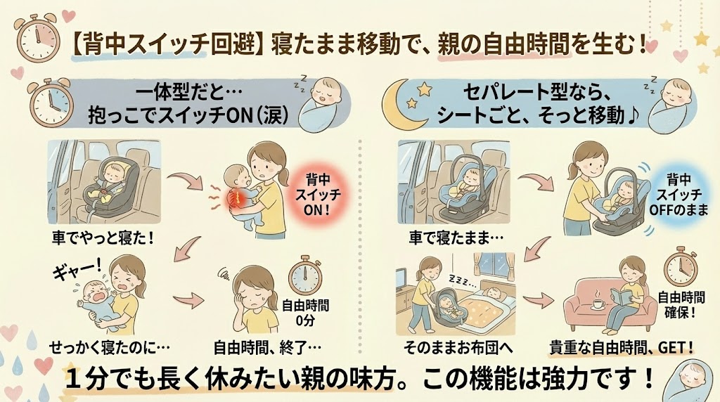 一体型の場合、車から抱き上げる瞬間に「背中スイッチ」が発動し、「ギャー!」と泣かれて再び1時間の寝かしつけコース…という絶望も珍しくありません。