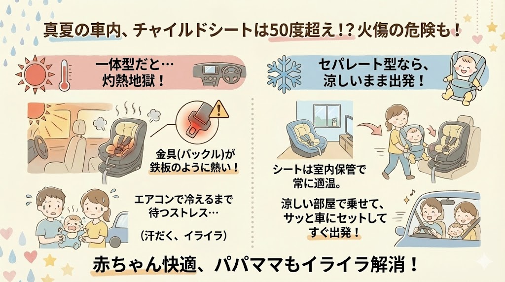 真夏の車内は50度を超える場合もあり、置きっぱなしのチャイルドシートは金具(バックル部分)が鉄板のように熱くなります。